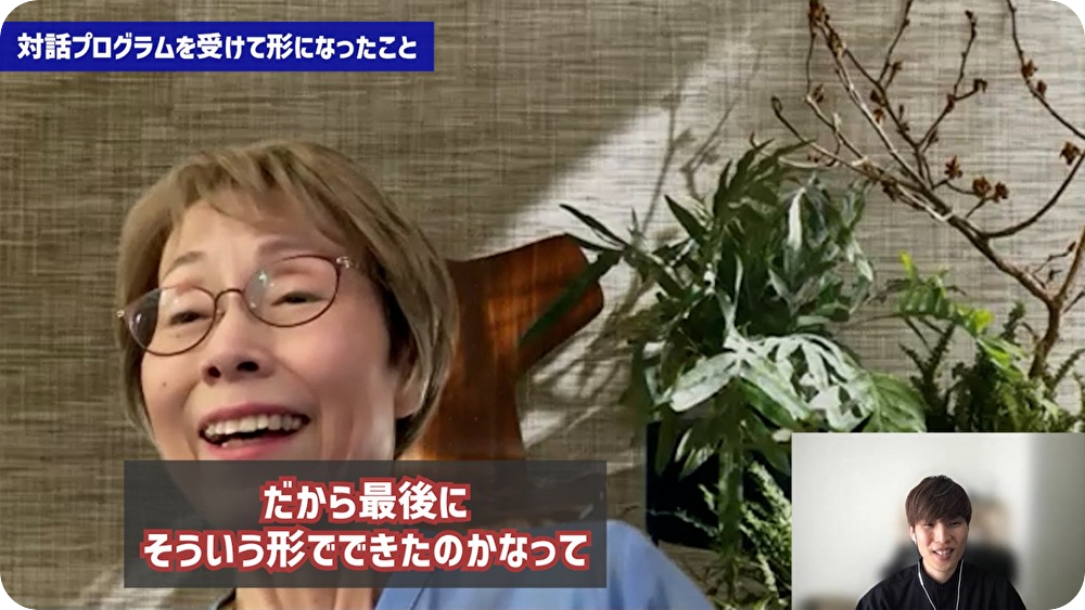 2018年から6年間かけて300名以上の方と1対1の対話を行い、その経験をもとに、2023年に独自の「対話プログラム」を開発しました。現在はプログラムのクライアントさんと対話する毎日を過ごしています。